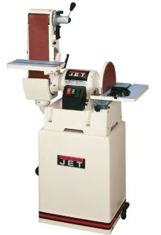 The JET JSG-6CS Sander combines a 12" disc and a 6" x 48" belt to provide raw industrial 1.5 HP sanding power. The exclusive dual thumbscrew belt tracking adjustment locks to keep the belt on track while tackling any tough application. The sander boasts both a quick release belt tension lever and a quick lock dust cover for the disc. The built in handle allows for easy portability around the workshop while the included stand saves room on your workbench.