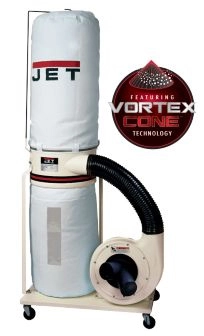 he JET DC-1100VX features the exclusive Vortex Cone™ which improves chip separation to prevent clogging of the filter, and increases packing efficiency of the collector bag. The high air velocity (CFM) stands up to any competitive specifications, and the industrial controls are designed for years of durable use. Collection bags have an elastic band for fast installation and removal. Swivel casters offer maneuverability within the shop.