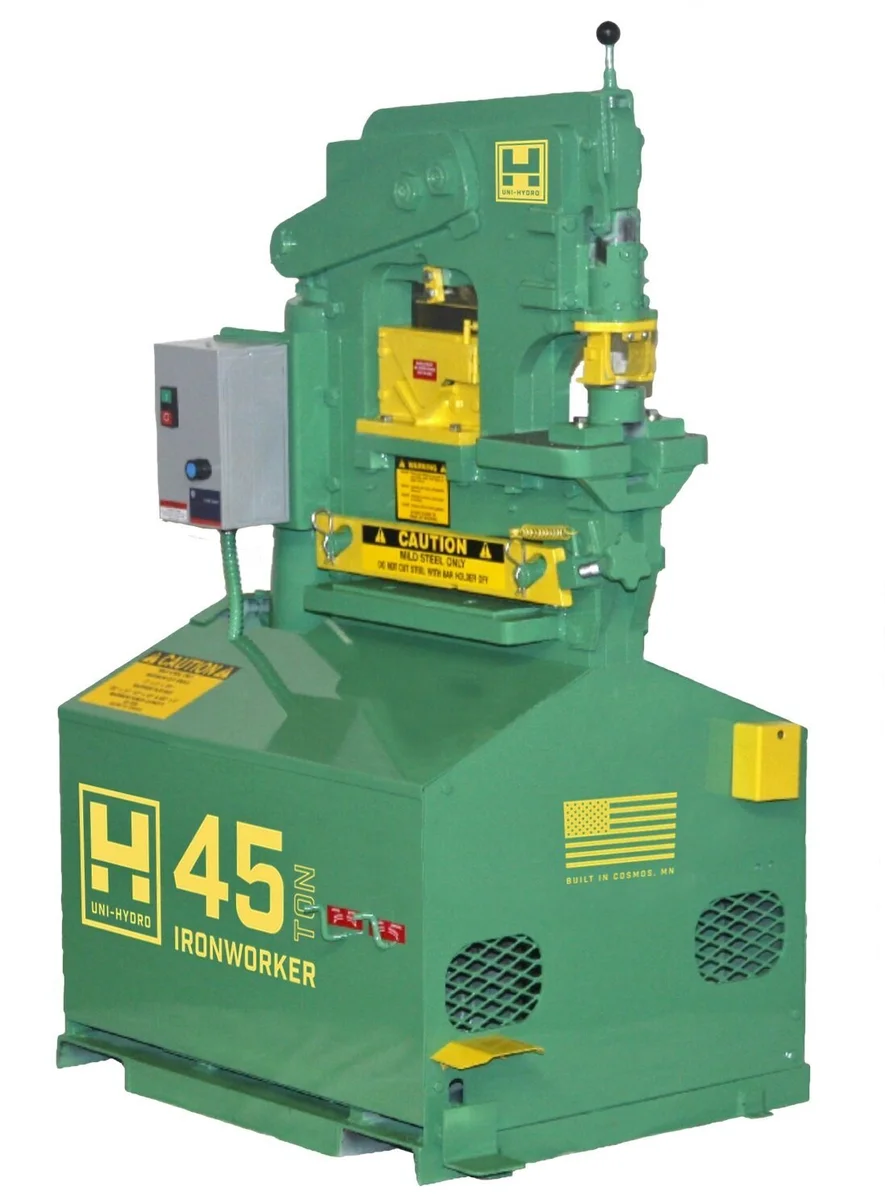 Uni-Hydro’s Model 45-14 is a rugged and compact three station ironworker that has been the signature machine for our company since 1980. Today, it’s still the industry’s leader in capacity, quality of cuts, power, versatility and affordability. This Model enhances all the Uni-Hydro Ironworkers in giving a customer more tonnage and capacity for the dollar.