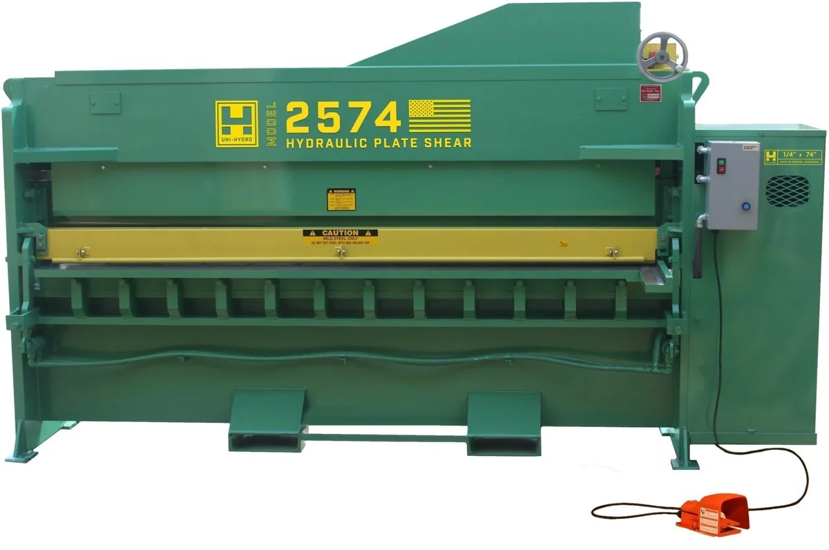 The Uni-Hydro Model 2574 Plate Shear is a compact powerhouse that provides our customers with decades of trouble free metal cutting operation. This plate shear is engineered to deliver increasing power throughout the cut with a patented system that utilizes a cylinder that is center mounted on the blade and uses pivot arms to transfer energy to three pressure points. The result is up to a 115% performance gain as the cut finishes. No other competitors shear matches this performance!
